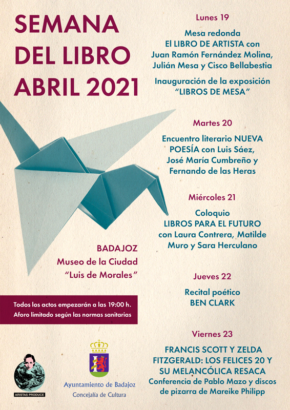 Del 19 al 23 de abril celebraremos la Semana del Libro con una serie de actividades que se desarrollarán en el Museo de la Ciudad “Luis de Morales”. Un evento organizado por la Concejalía de Cultura que pretende tomar el pulso de la actualidad literaria y libresca a través de coloquios y actuaciones, enmarcados en la sala de exposiciones donde se mostrará el trabajo editorial y plástico de los libros de artista.